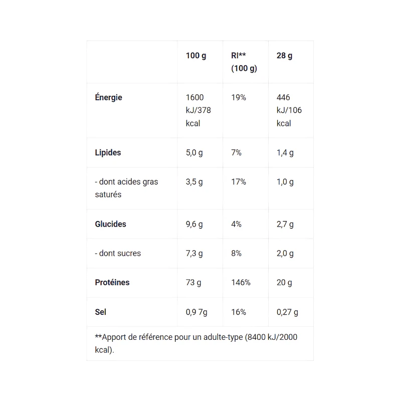 | Protéines | 73 g | 20 g |